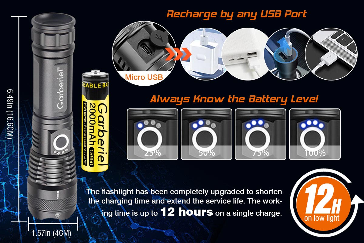| Packing list: | Garberiel XHP 50 Flashlight 1161 x 1 Rechargeable 18650 Battery x 1 USB Cable Charger x 1 Lanyard x 1 Flashlight Instruction x 1 |