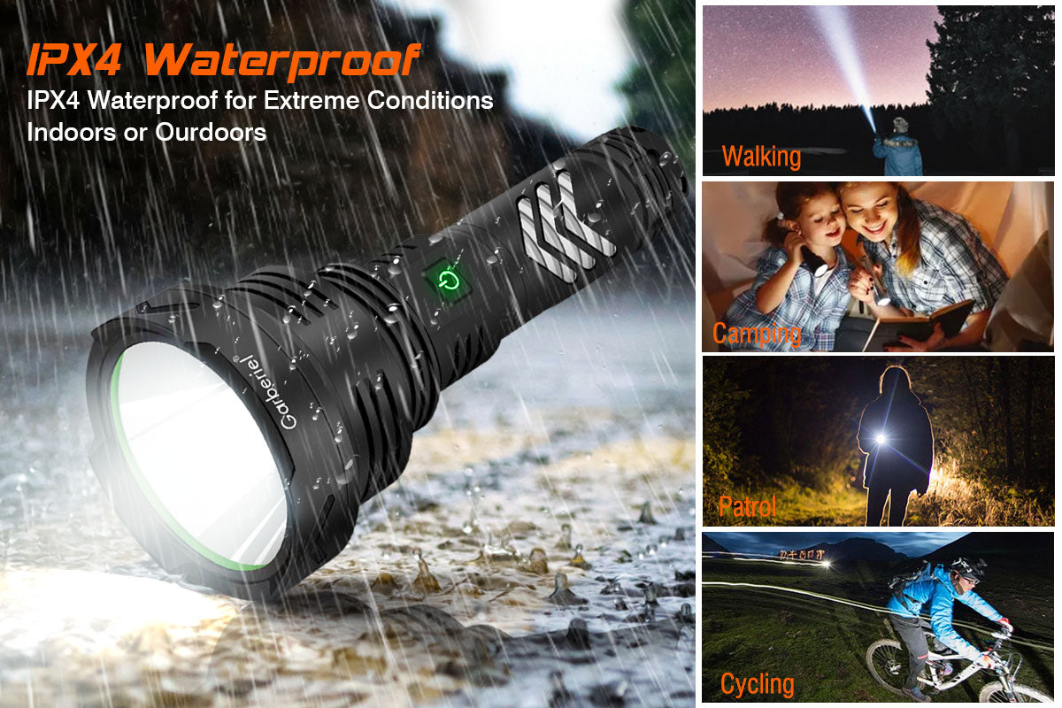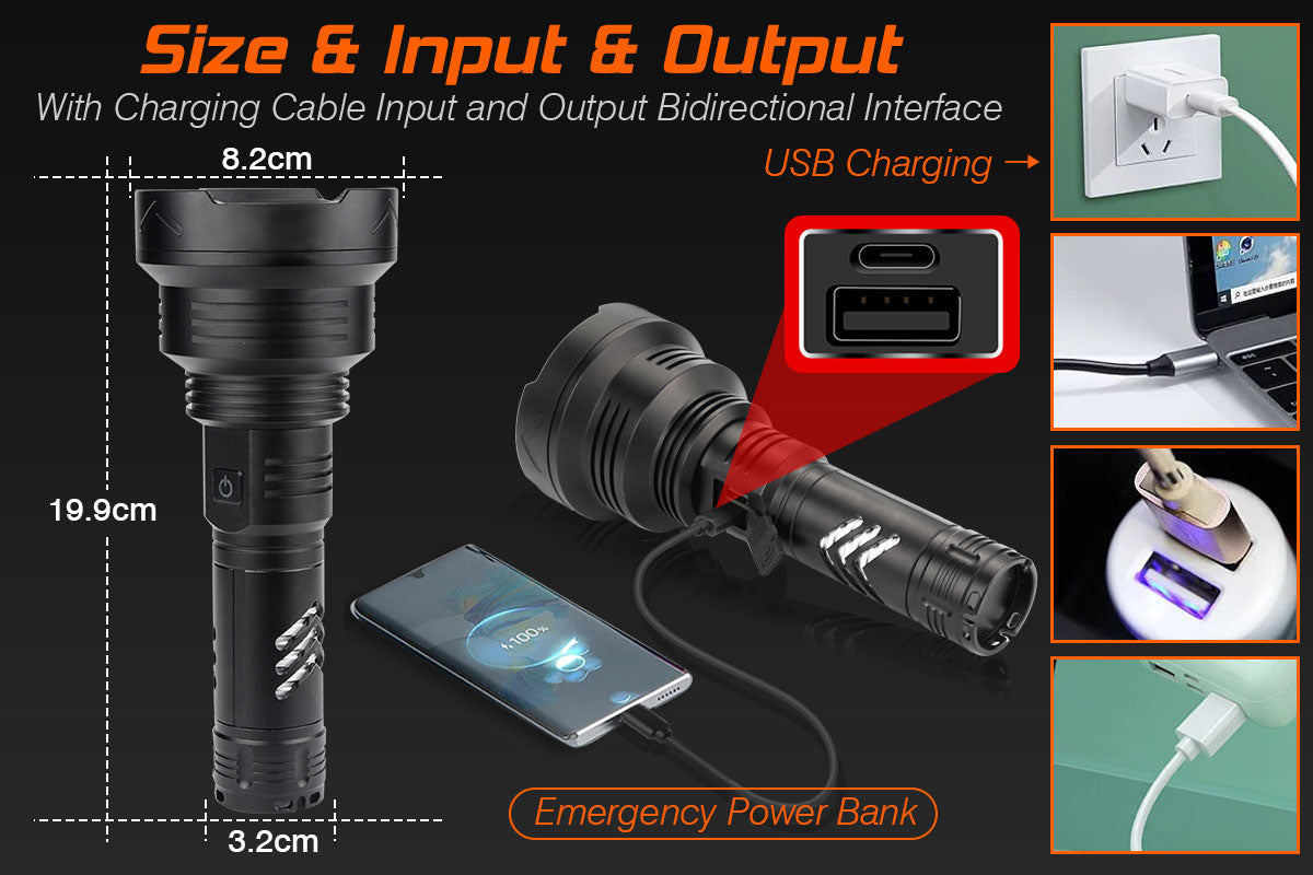 The rechargeable flashlight features a USB power output like a backup emergency power bank. You can charge your phone or mobile devices in an emergency.
