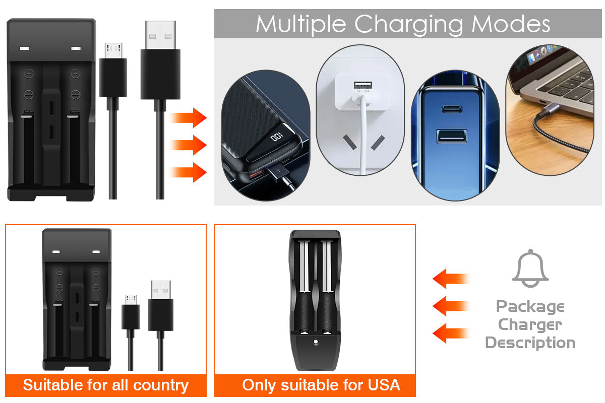 | SET: 2 PACK IN US | · T6 Blub Flashlight * 2 · 18650 Battery * 4 · 2 bay battery charger (US location is a US plug charger) * 2 · Flashlight Instruction * 2 |